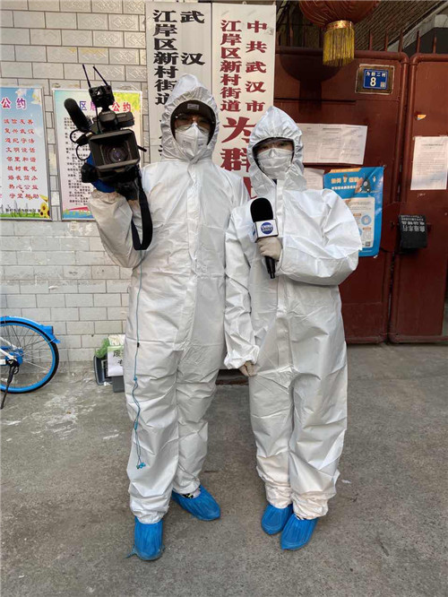 中國日報記者孟哲、朱興鑫、王曉東、吳勇、王曉瑩、蘇峰(從左至右)在雷神山醫院采訪現場(朱興鑫供圖)