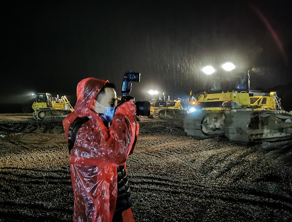 1月25日,新華社記者肖藝九冒雨在火神山醫(yī)院建設(shè)工地采訪。新華社供圖