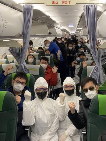 2月1日凌晨,在從日本東京羽田機場飛往武漢天河機場的航班上,旅客與機組乘務人員合影留念。