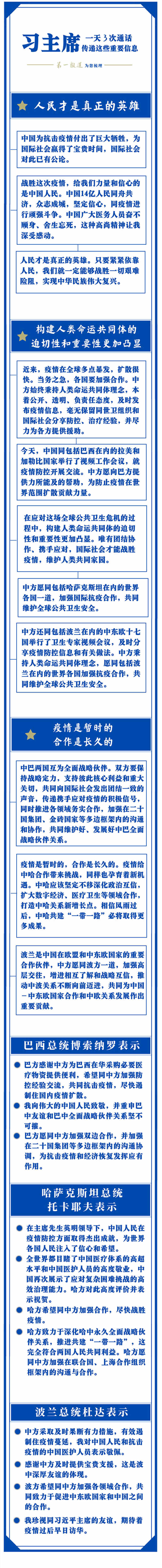 頻密互動,高效溝通。習主席通話內(nèi)容信息量很大:介紹中國抗疫努力,深化國際抗疫合作,推動雙邊關(guān)系發(fā)展……其中,“合作”與“人類命運共同體”是習主席反復提到的關(guān)鍵詞。