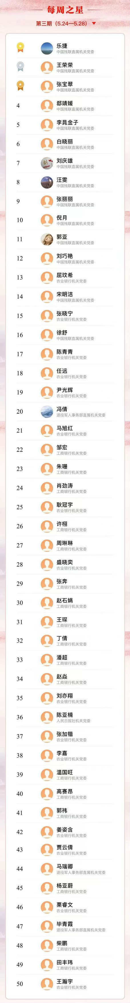 “黨在我心中”中央和國家機(jī)關(guān)青年黨史知識(shí)大賽截至目前參賽人數(shù)已突破7萬人,產(chǎn)生了第三期每周之星50名。