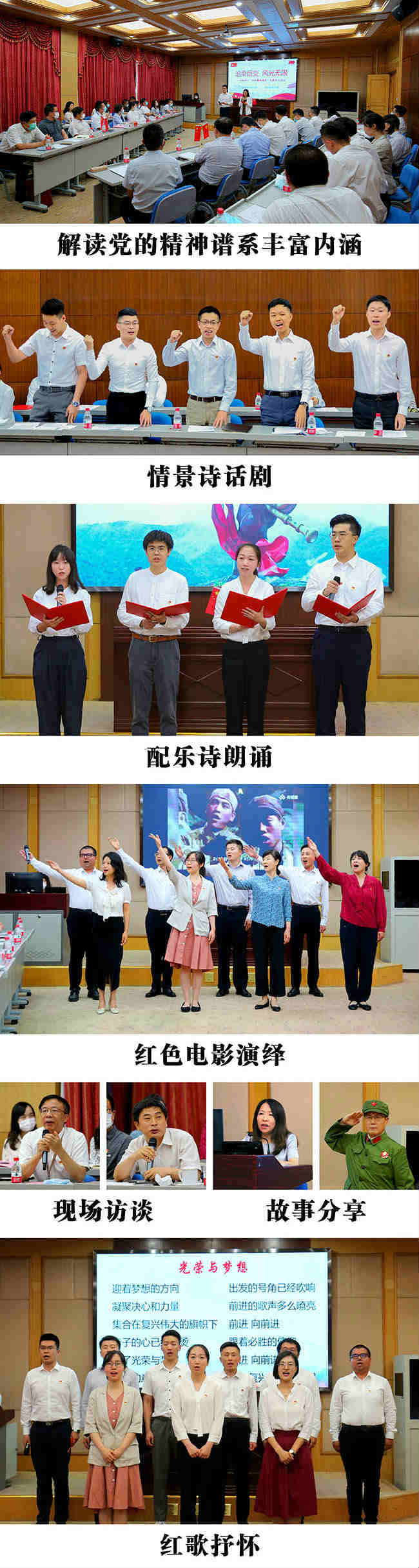 活動分為四個篇章。第一篇章“開天辟地,前赴后繼”。通過情景詩話劇《紅船》、配樂詩朗誦《巍巍井岡》、誦讀毛澤東同志長征詩詞和圖說延安等形式著重頌揚了紅船精神、井岡山精神、長征精神、延安精神等,彰顯了老一輩中國共產(chǎn)黨人在新民主主義革命時期拋頭顱、灑熱血、捐身軀、照汗青的革命精神和英雄氣概。第二篇章“改天換地,日新月異”。通過觀看《英雄兒女》《我的祖國》等電影片段、分享航天“七勇士”英雄故事等形式,重溫抗美援朝精神、“兩彈一星”精神等,凸顯中國共產(chǎn)黨人在社會主義革命和建設(shè)時期始終堅持自力更生、艱苦奮斗、踏實苦干、發(fā)憤圖強的不屈風骨。第三篇章“翻天覆地,攻堅克難”。通過老黨員訪談、老照片敘事等形式回憶解讀了改革開放精神、抗洪精神、抗震救災(zāi)精神,詮釋了中國共產(chǎn)黨人在改革開放和社會主義現(xiàn)代化建設(shè)新時期始終堅持勵精圖治、團結(jié)奮進、迎難而上、眾志成城的優(yōu)秀品格。第四篇章“驚天動地,復興追夢”。通過觀看解讀相關(guān)視頻,交流分享了偉大抗疫精神、脫貧攻堅精神,體現(xiàn)了中國共產(chǎn)黨人在中國特色社會主義新時代始終堅持人民至上、創(chuàng)新發(fā)展理念、敢于擔當作為、構(gòu)建人類命運共同體等崇高追求。