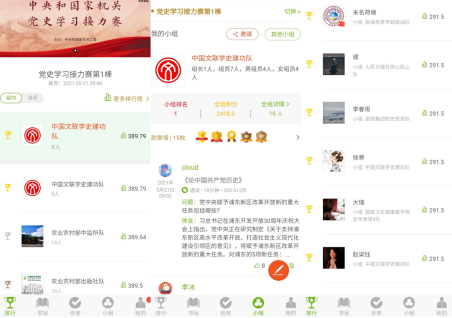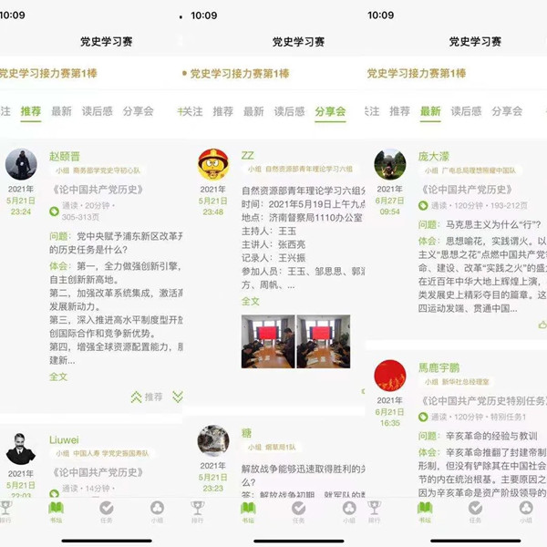 4月17日,黨史學習接力賽正式開始,第一棒《論中國共產黨歷史》有317支參賽隊3608人參與。參賽選手通過“旗幟微平臺”黨史學習接力賽小程序,在35天里完成圖書閱讀、回答問題、寫讀后感、組織線下讀書會和閱讀分享會、互評等,共計發表了11.6萬條閱讀體會,人均閱讀時間1261分鐘。近8000人次參與了“金句摘抄”等特別任務,參賽選手共提交近3000篇讀后感,累計約305.5萬字。各參賽隊召開了近300場閱讀分享會,形成了121.3萬字的分享會紀要。選手們積極互動,形成了互相探討、學習實踐的熱烈氛圍,共有56.3萬次點贊、40.1萬條評論。