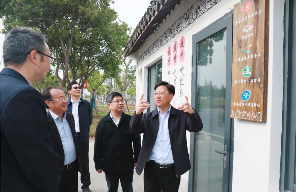 >> 作者( 右一) 在金山區廊下鎮山塘村調研滬浙毗鄰黨建工作。