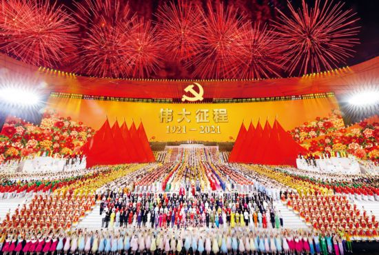 在百年奮斗歷程中,中國共產黨團結一切可以團結的力量、調動一切可以調動的積極因素,最大限度凝聚起共同奮斗的力量,推動著中國發展進步的歷史車輪滾滾向前。2021年6月28日晚,慶祝中國共產黨成立100周年文藝演出《偉大征程》在國家體育場盛大舉行。圖為文藝演出結束,全場共同高唱《沒有共產黨就沒有新中國》。 新華社記者 龐興雷/攝