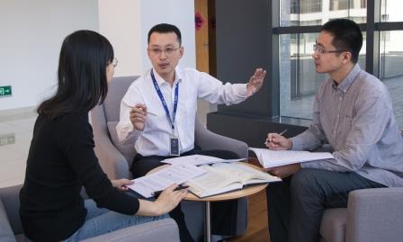 柴華(中)與同事們探討專利審查業(yè)務(wù)開(kāi)展