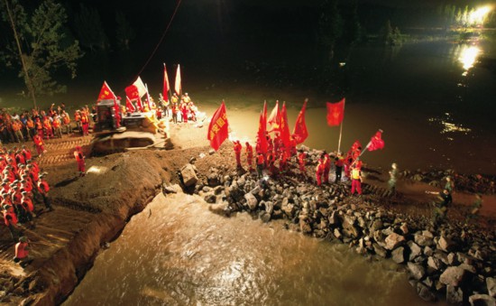 2021年7月17日至23日,河南持續(xù)遭遇極端強(qiáng)降雨天氣。7月22日,鶴壁市浚縣新鎮(zhèn)鎮(zhèn)彭村段衛(wèi)河大堤發(fā)生決口。前來救援的中國安能集團(tuán)在搶險一線成立4個黨小組,分別負(fù)責(zé)現(xiàn)場指揮、決口封堵、裹頭加固、綜合保障工作。在黨小組的組織下,現(xiàn)場169名救援人員匯聚成沖不垮的“紅色堤壩”,經(jīng)過70多個小時的艱苦奮戰(zhàn),終于使衛(wèi)河大堤決口合龍。這是2021年7月26日凌晨決口成功合龍后,救援人員在大堤上揮舞紅旗(無人機(jī)照片)。 新華社發(fā) 張小明/攝