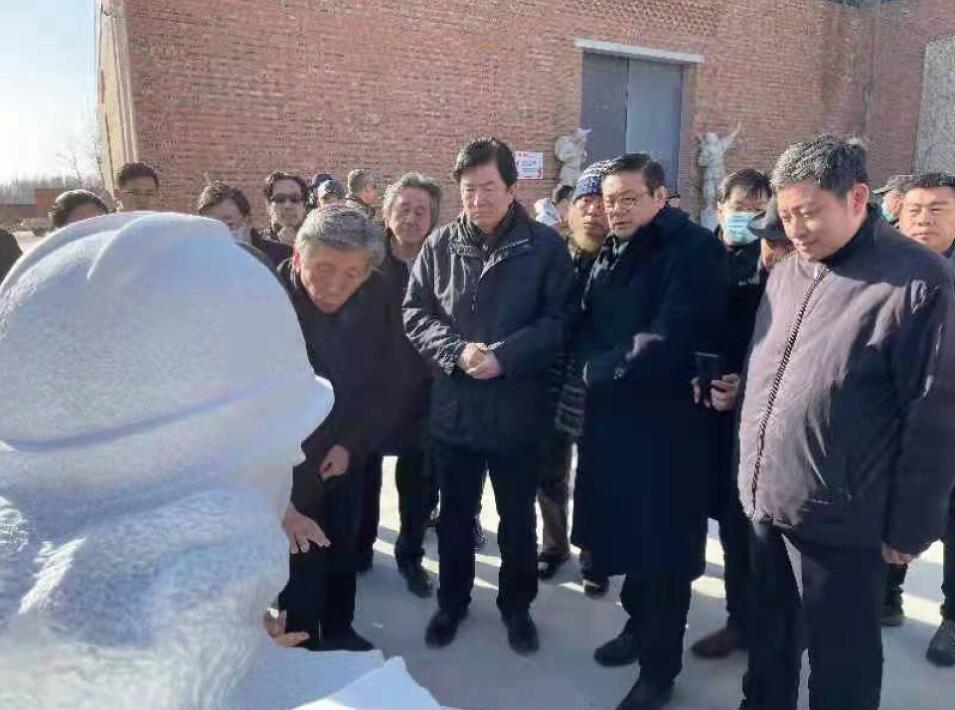 >> 2020年12月,作者 (中) 與“建黨100周年主題雕塑創作工程”主創團隊在河北曲陽雕塑制作生產現場。