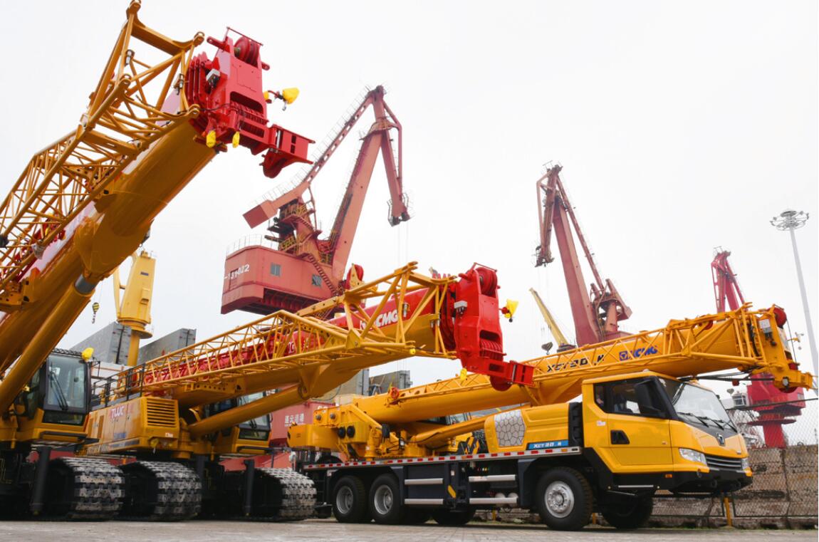 >> 一批工程機械設備在江蘇連云港港口碼頭集結等待裝船出口。
