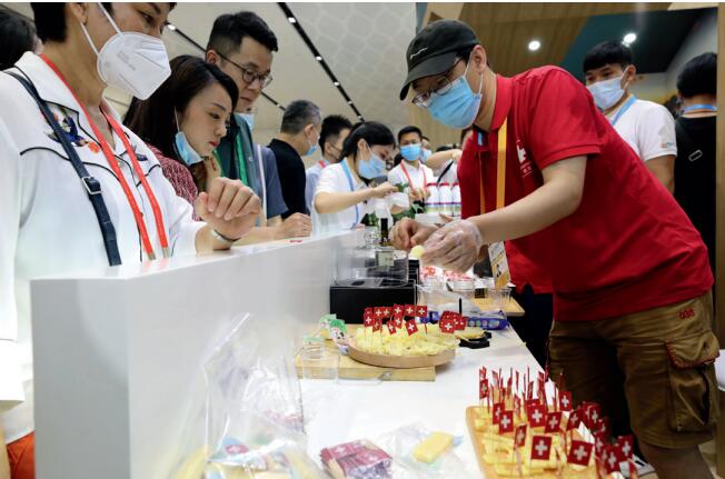 >> 在海口市開幕。圖為在海南國際會議展覽中心時尚生活展區(qū),參觀者排隊體驗來自瑞士的奶酪。