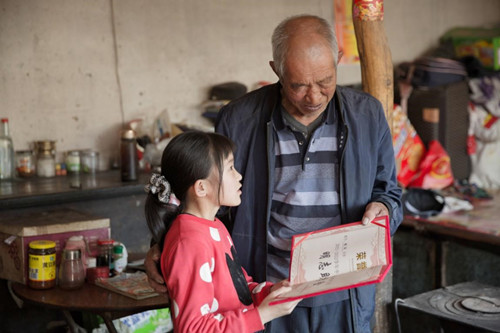 受資助學生把“明志獎學助學金”榮譽證書帶回家給爺爺看。