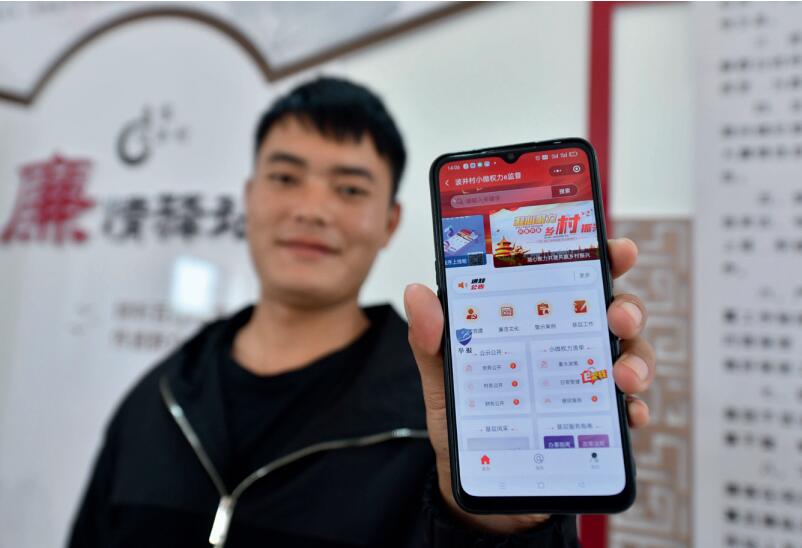 >> 2021年12月16日,在廣西鹿寨縣鹿寨鎮波井村政務服務中心,村民展示“微權力監督e廉線”小程序。