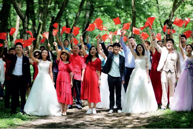 >> 游客在黃山市徽州區(qū)西溪南村楓楊林里揮舞國旗,抒發(fā)熱愛祖國熱愛家鄉(xiāng)的自豪之情。