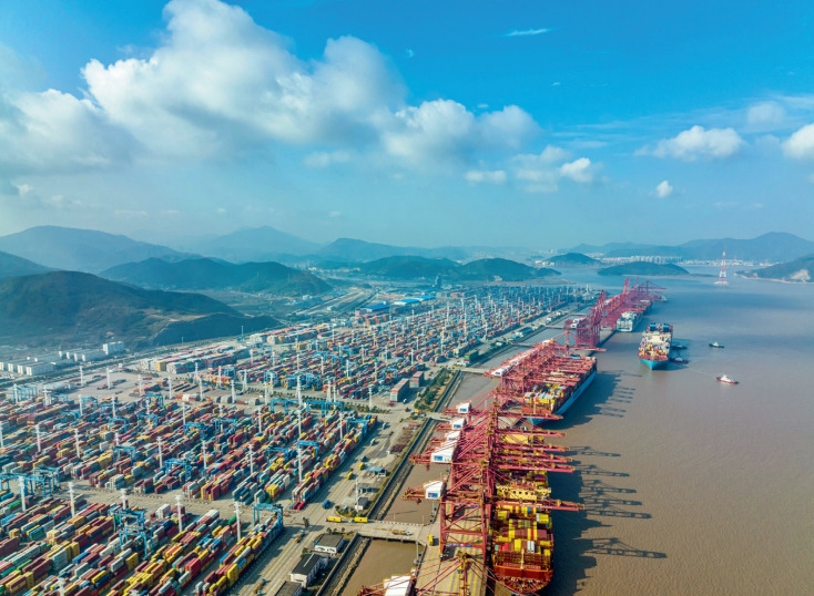 >> 兩年多前,在寧波舟山港調研后不久,習近平總書記根據對新形勢的思考,提出“構建以國內大循環為主體、國內國際雙循環相互促進的新發展格局”。圖為浙江寧波舟山港穿山港區。