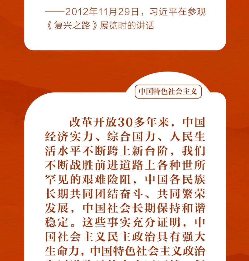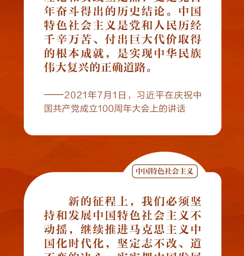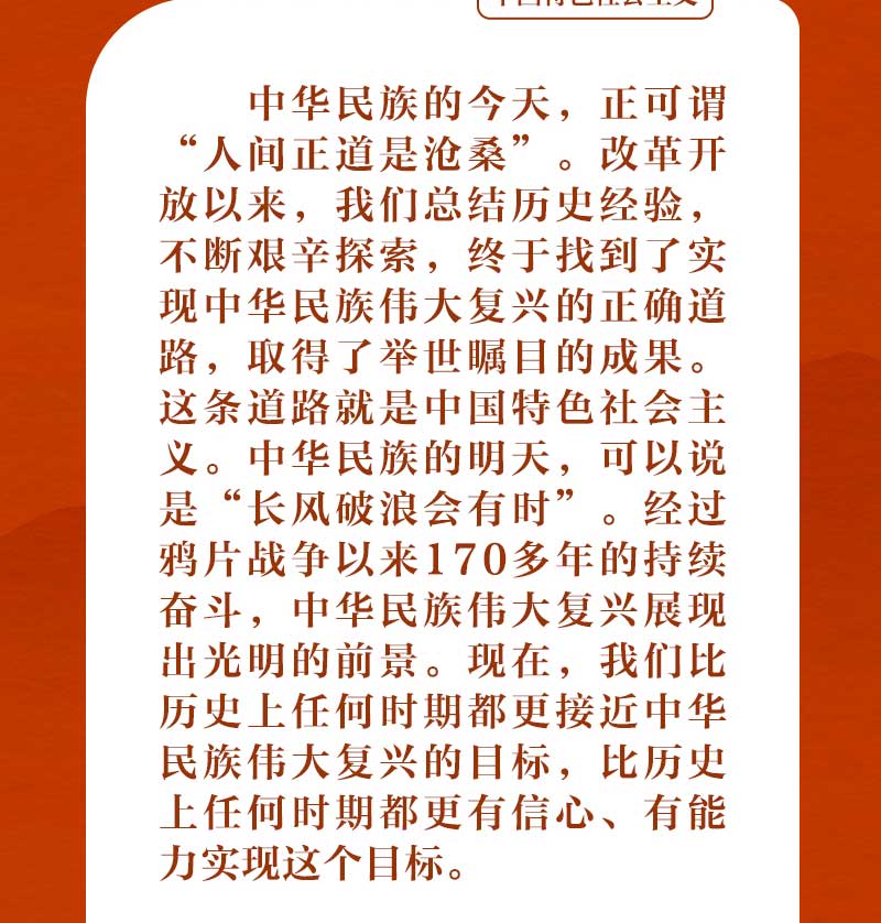 歷史和現(xiàn)實都告訴我們,只有社會主義才能救中國,只有中國特色社會主義才能發(fā)展中國,只有堅持和發(fā)展中國特色社會主義才能實現(xiàn)中華民族偉大復興。這是歷史的結(jié)論,也是人民的選擇。我們一起從習近平總書記的重要論述中體會其深刻含義。