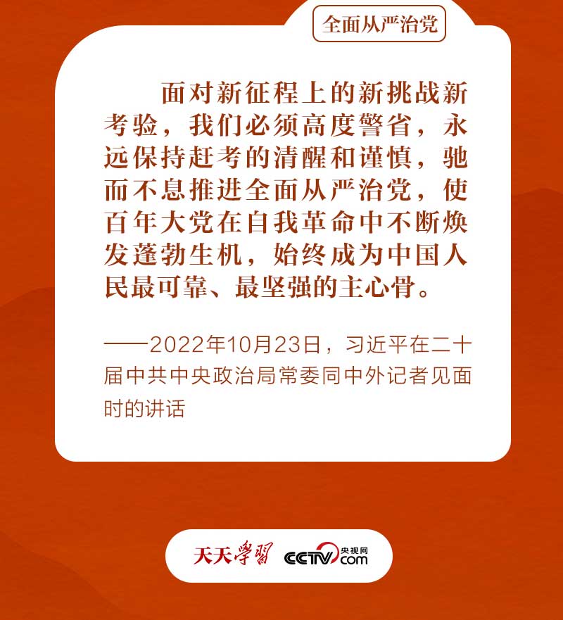 黨的二十大報(bào)告明確提出,“全面從嚴(yán)治黨永遠(yuǎn)在路上,黨的自我革命永遠(yuǎn)在路上”,為堅(jiān)持不懈把全面從嚴(yán)治黨向縱深推進(jìn)、確保黨永葆旺盛生命力和強(qiáng)大戰(zhàn)斗力指明了方向。