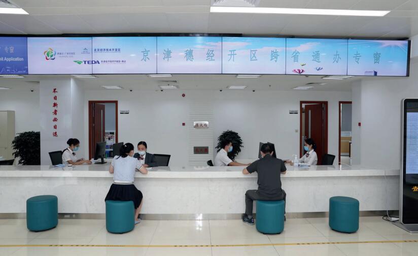 2021年8月,北京經開區、天津經開區、廣州開發區簽署《京津穗經開區政務服務改革創新合作聯盟框架協議》,成立全國首個經濟功能區政務服務改革創新合作聯盟,推出268項政務服務事項“跨省通辦”服務。圖為群眾在廣州開發區京津穗經開區“跨省通辦”專窗辦理相關事項。