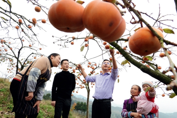 >> 2022年11月20日,在四川省達州萬源市魏家鎮熊家壩村種植園內,來自浙江省舟山市普陀區的幫扶干部(左三)在給果農培訓陽豐脆甜柿子種植技術。