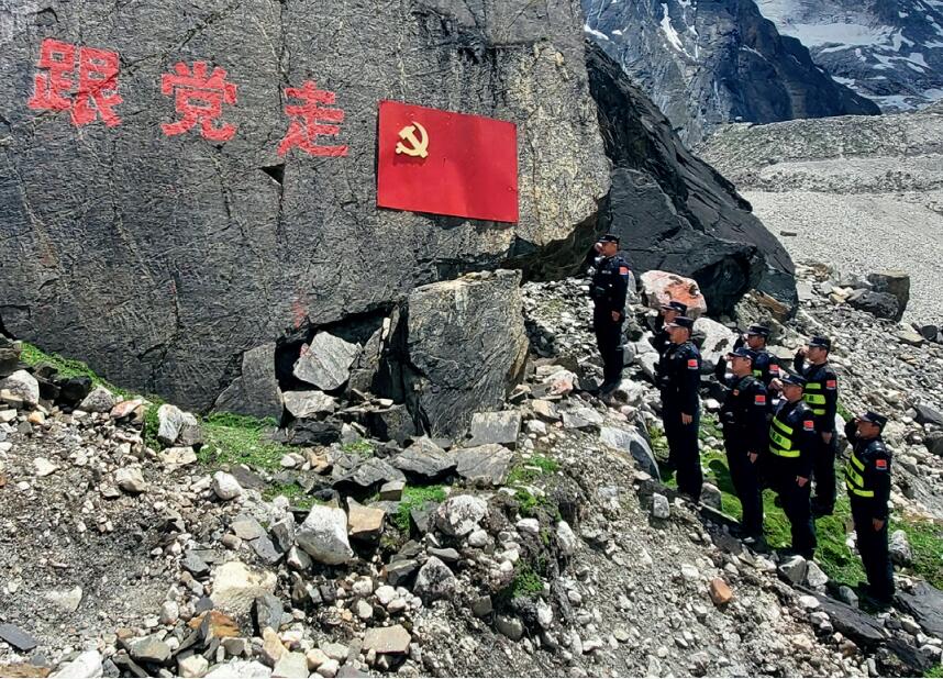 西藏出入境邊防檢查總站山南邊境管理支隊邊巴邊境派出所民警在邊境一線重溫入黨誓詞。