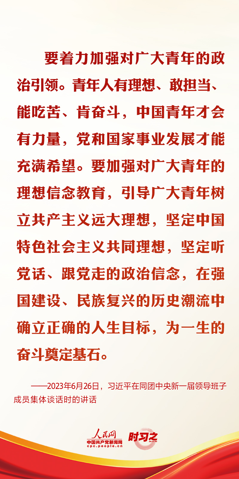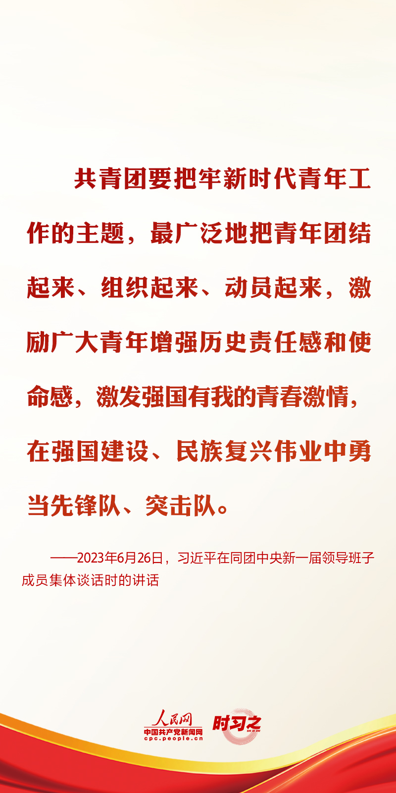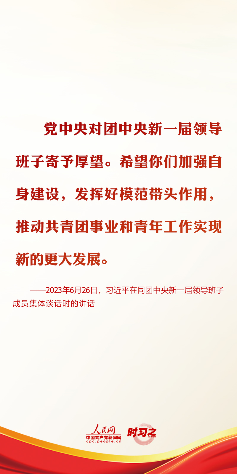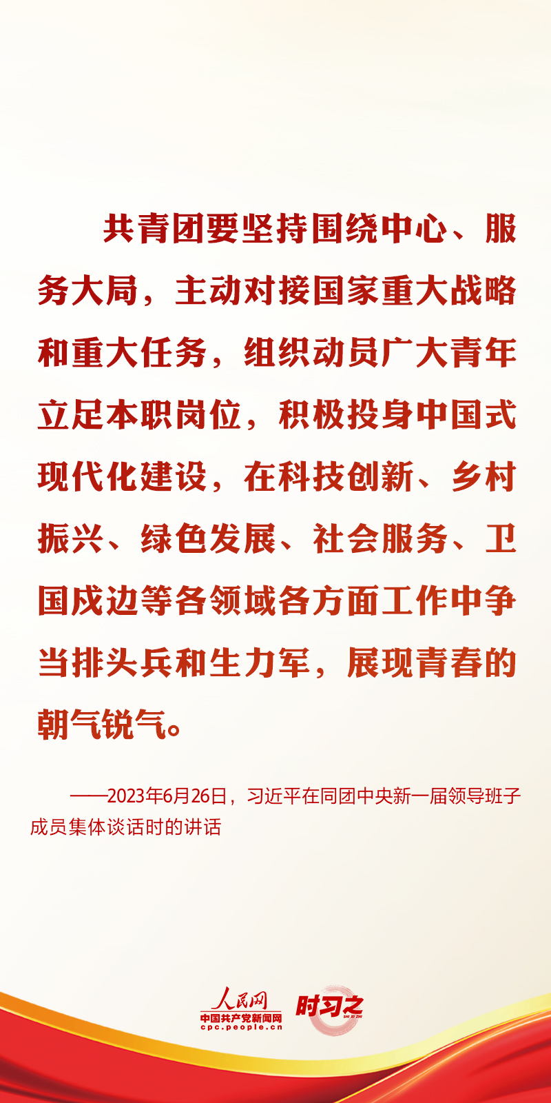 2023年6月26日,中共中央總書記、國家主席、中央軍委主席習近平在中南海同團中央新一屆領(lǐng)導班子成員集體談話并發(fā)表重要講話。講話中,習近平總書記對共青團和青年工作提出了要求與希望。