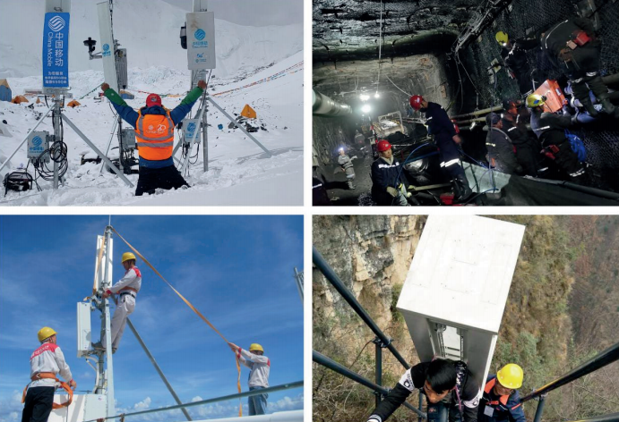 >> 我國建成全球規模最大的5G網絡,圖中珠穆朗瑪峰(左上)、地下800多米深的礦井(右上)、南沙群島永暑礁(左下)、四川涼山“懸崖村”(右下)等均實現5G網絡全覆蓋。
