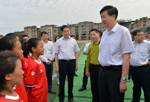 >> 6月6日,作者(前排右一)到四川省內(nèi)江市資中縣體育場調(diào)研女足青訓工作。