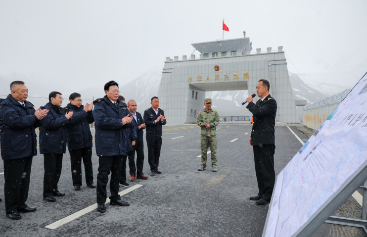 >> 7月12日,作者(左四)在紅其拉甫口岸調(diào)研并看望慰問一線關(guān)警員。