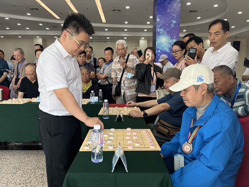 賽后,象棋世界冠軍、特級大師蔣川與獲得個人單項前十名的棋手進行了車輪戰表演。蔣川氣定神閑地在10名棋手之間來回踱步、輪番對陣。迎戰的老同志們也全神貫注、認真應對,盡情享受著和大師過招的機會。現場精彩紛呈,引來陣陣喝彩。
