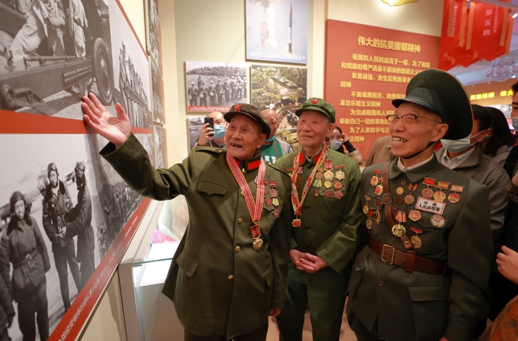 >> 2020年10月25日,“銘記偉大勝利 捍衛(wèi)和平正義——紀(jì)念中國(guó)人民志愿軍抗美援朝出國(guó)作戰(zhàn)70周年主題展覽”在中國(guó)人民革命軍事博物館正式向公眾開(kāi)放參觀。圖為曾參加抗美援朝出國(guó)作戰(zhàn)的老兵在展覽現(xiàn)場(chǎng)相互交流。