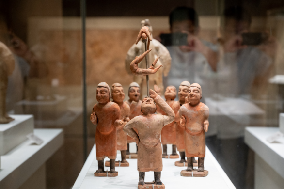 >> 9月21日,山西博物院“晉·見中國——百件山西文物中的華夏文明”展覽展出的北魏時期胡人彩繪雜技陶俑吸引參觀者拍攝記錄。