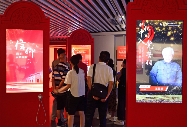>> 9月12日,觀眾在上海中共一大紀念館專題展廳參觀“永恒的誓言——中國共產黨入黨宣誓文物史料專題展”。