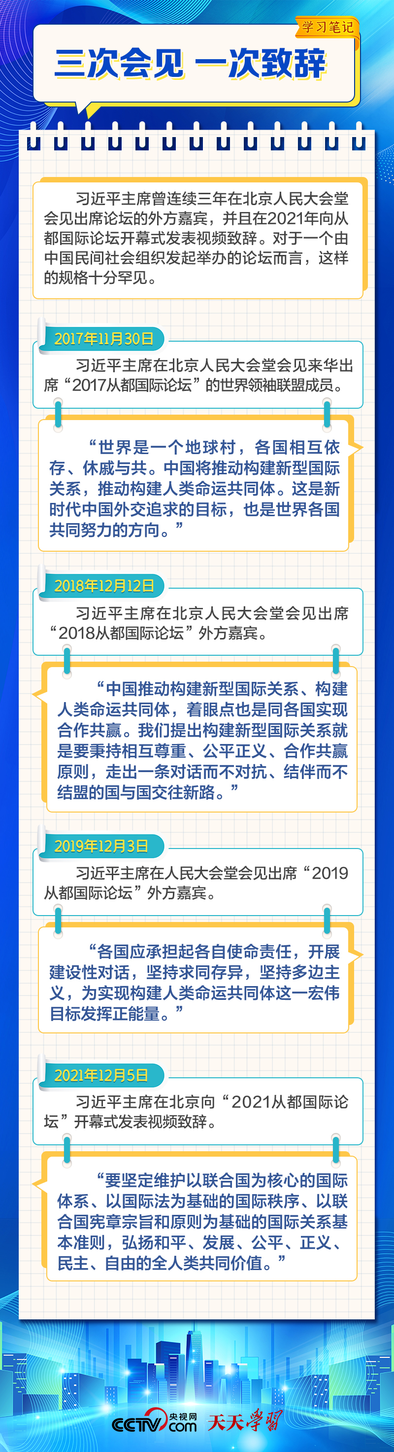 12月4日,習近平主席在致“2023從都國際論壇”的賀信中強調,面對前所未有的世界之變、時代之變和歷史之變,人類社會必須團結起來,堅持互學互鑒、開放包容、合作共贏,弘揚全人類共同價值,共同建設更加美好的世界。