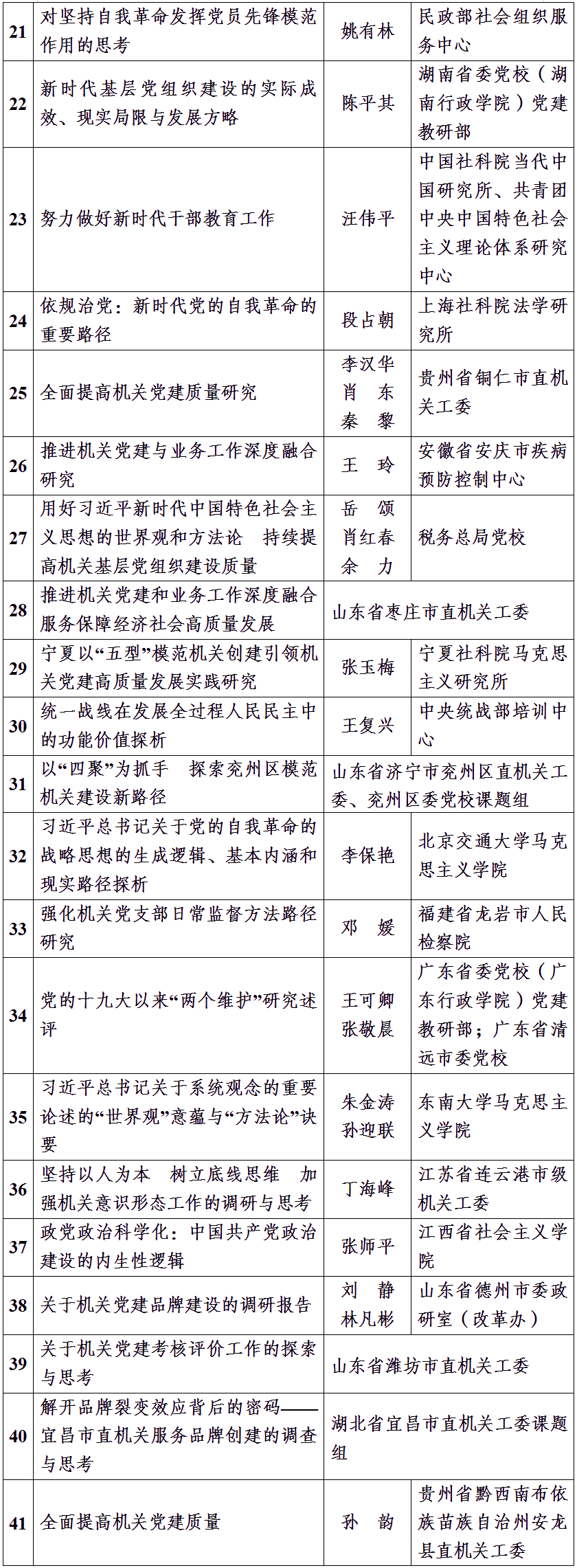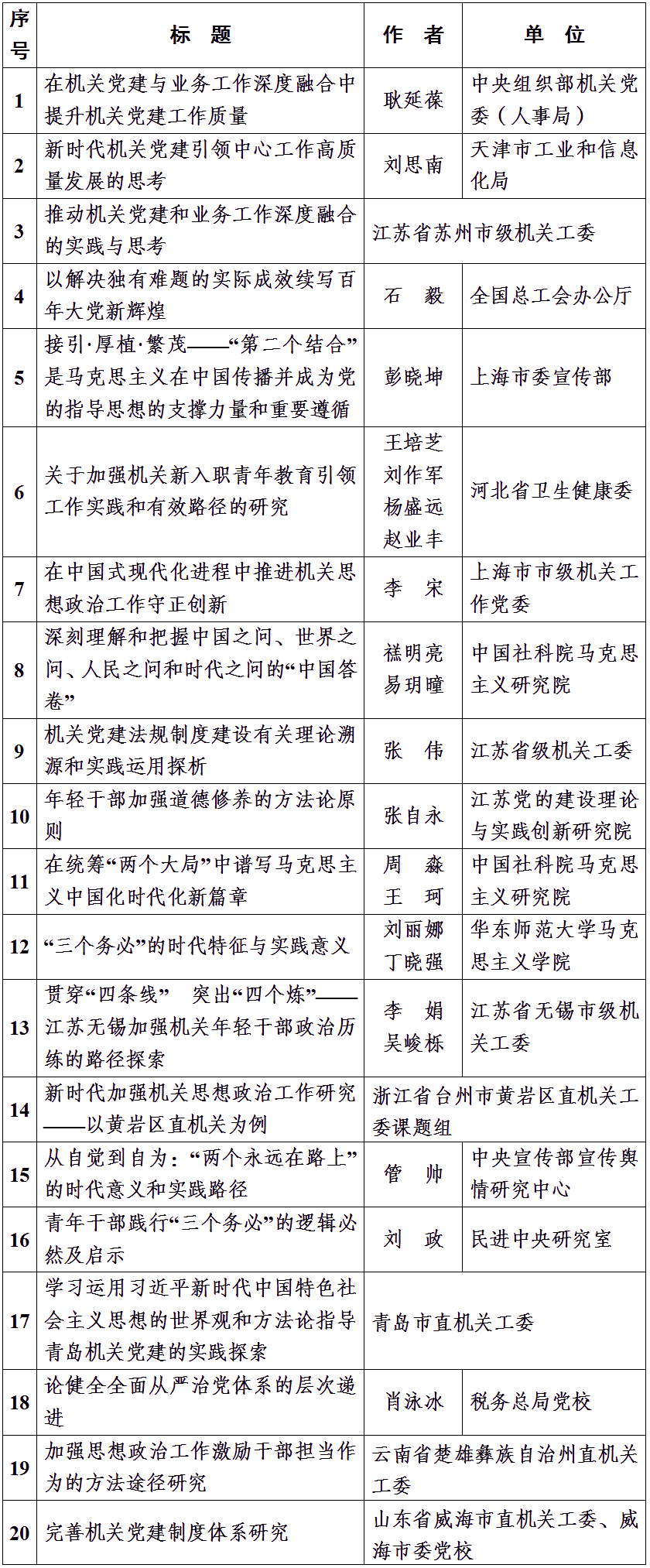 為深入學習貫徹黨的二十大精神和習近平新時代中國特色社會主義思想,持之以恒推進習近平總書記在中央和國家機關(guān)黨的建設(shè)工作會議上的重要講話精神貫徹落實,進一步做好機關(guān)黨建理論研究與交流工作,全面提高機關(guān)黨建質(zhì)量,機關(guān)黨建研究雜志社自2023年4月起開展了理論征文活動。征文活動在廣大黨員干部及理論研究工作者中引發(fā)熱烈反響,截至活動結(jié)束,共收到征文近600篇。按照公平公正原則,雜志社組織評審組經(jīng)過初評和復(fù)評,評出60篇優(yōu)秀理論征文(名單如下)。感謝廣大讀者長期以來對理論征文活動的熱情參與,希望今后一如既往地關(guān)心支持《機關(guān)黨建研究》雜志!