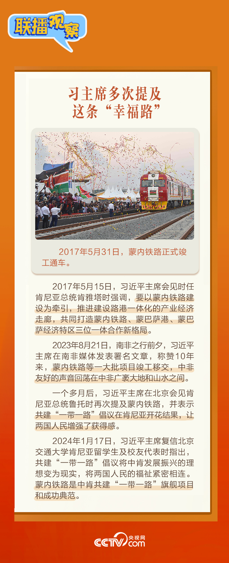 此前,習主席在外事活動中多次提及蒙內鐵路,《新聞聯播》也持續關注這條路的建設及開通后的運營情況。這條“幸福路”有何特別之處,習主席為何頻頻提及?它的建成通車給當地帶來哪些變化?