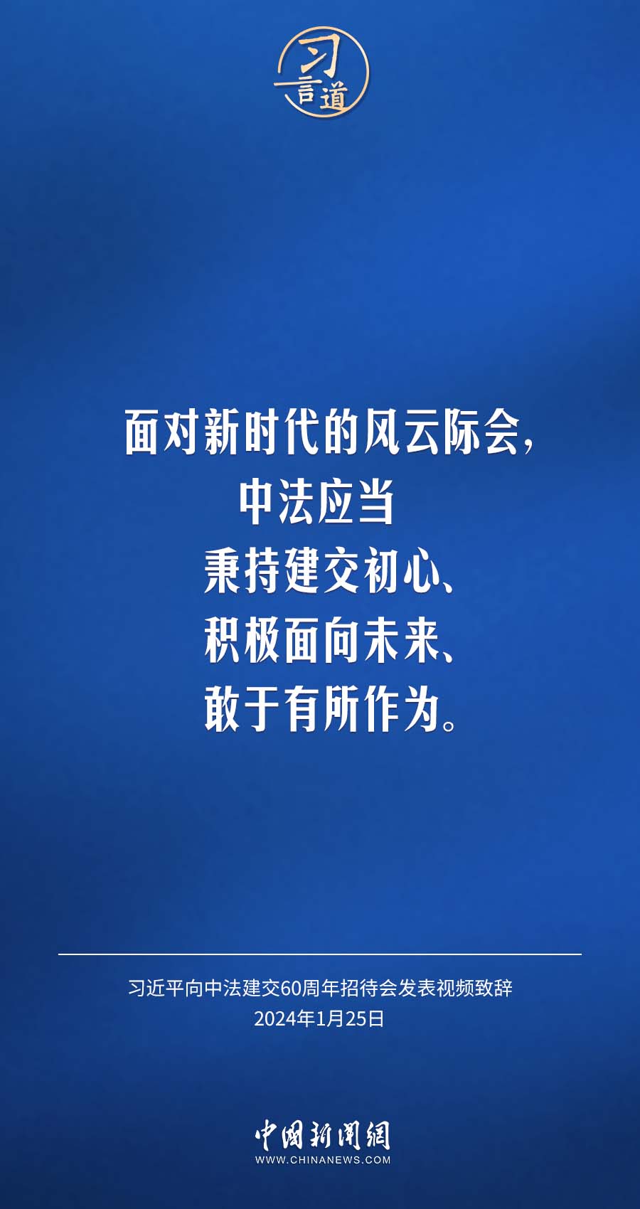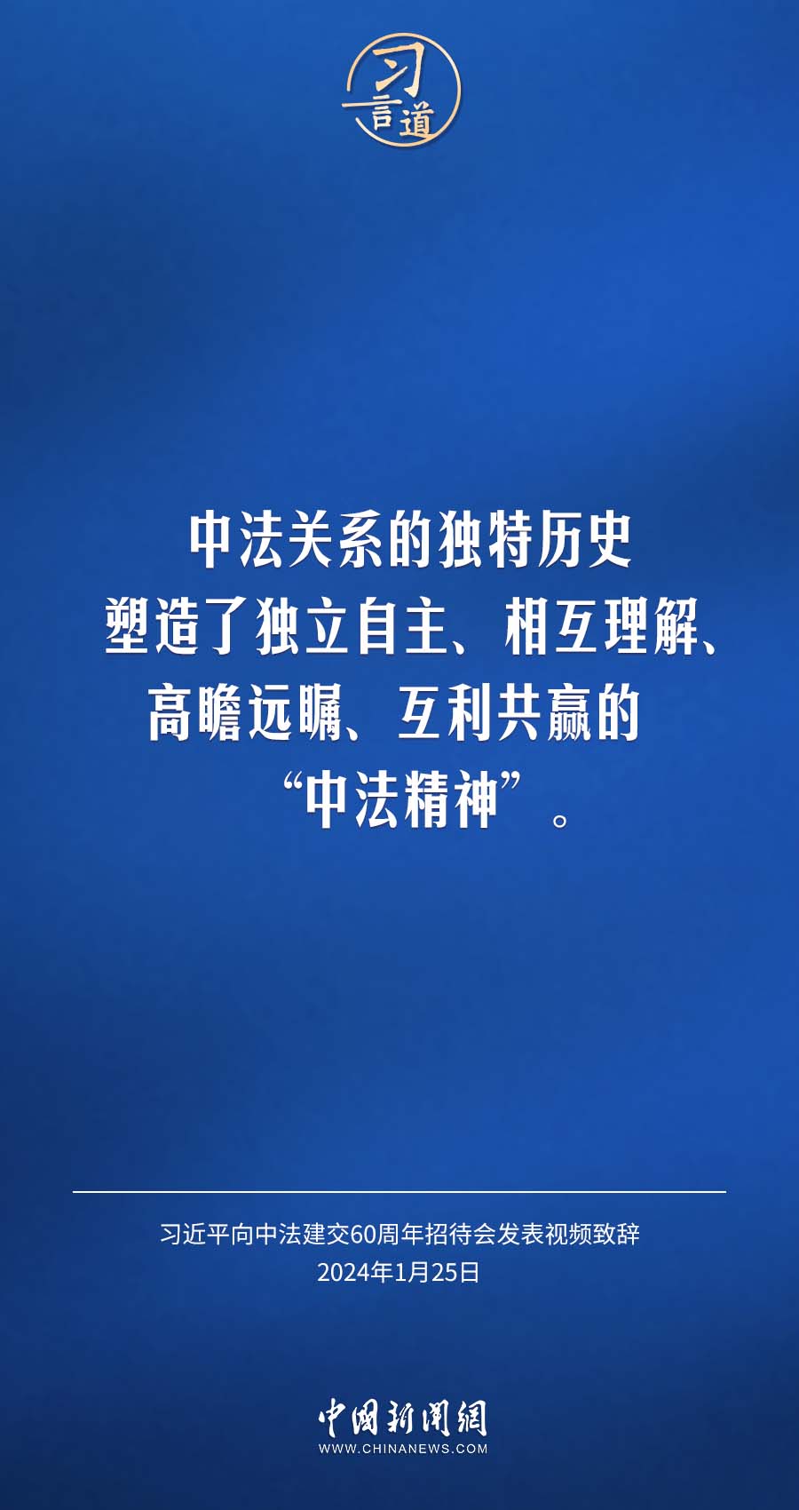 1月25日,中法建交60周年招待會(huì)在國家大劇院舉行,國家主席習(xí)近平發(fā)表視頻致辭。習(xí)近平指出——