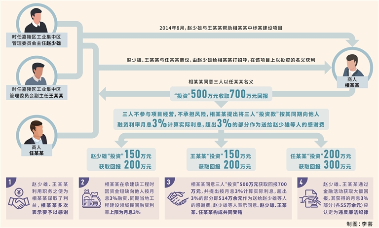 其中,2014年8月,時任嘉陵區工業集中區管理委員會主任的趙少雄與嘉陵區工業集中區管理委員會副主任王某某(另案處理)幫助相某某中標嘉陵區某建設項目。之后,趙少雄利用職務上的便利,為相某某在該項目的施工、驗收、撥款等方面提供幫助。其間,趙少雄、王某某與商人任某某(另案處理)商議,由趙少雄給相某某打招呼,在該項目上以“投資”的名義獲利。相某某考慮到自己要感謝趙少雄、王某某的幫助,且在項目建設中需要籌措資金,同期也按照月息3%向他人融資,便同意三人以任某某名義“投資”500萬元收取700萬元回報,三人不參與項目經營,不承擔風險。相某某提出,將三人“投資款”按同期向他人融資利率月息3%計算實際利息,超出3%的部分作為送給趙少雄等人的感謝費。趙少雄、王某某、任某某表示同意。2014年8月至2019年,趙少雄、王某某各“投資”150萬元,并各獲取回報200萬元,任某某“投資”200萬元,獲取回報300萬元。