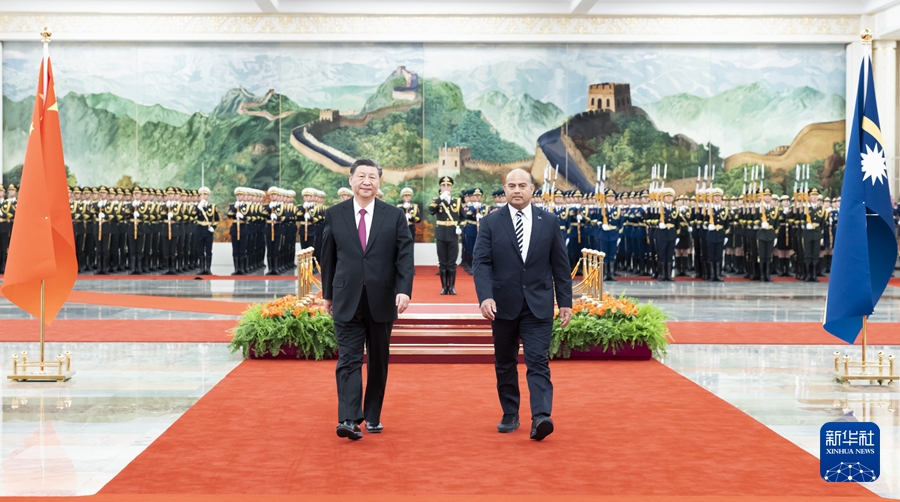 3月25日下午,國家主席習近平在北京人民大會堂同來華進行國事訪問的瑙魯總統阿迪昂舉行會談。這是會談前,習近平在人民大會堂北大廳為阿迪昂舉行歡迎儀式。新華社記者 申宏 攝