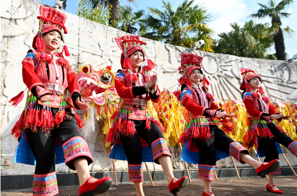 >> 2024年1月19日,“云南民歌大家唱 中華民族一家親”主題活動在云南省昆明市舉行。圖為花腰彝族演員歡快起舞。