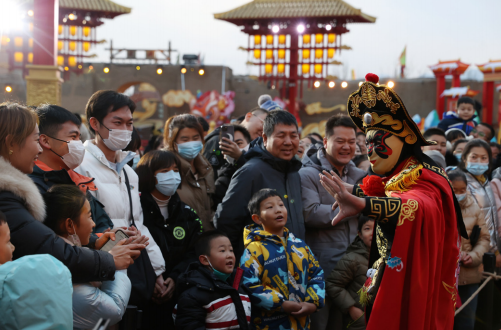 >> 2023年12月10日,民眾在寧夏銀川市“看見賀蘭”沉浸式演藝小鎮(zhèn)內(nèi)觀看川劇“變臉”表演。