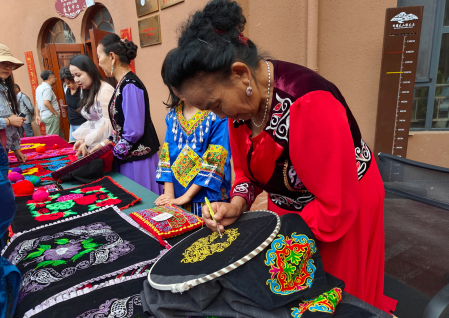 >> 聚焦鑄牢中華民族共同體意識主線,完整準確全面貫徹新時代黨的治疆方略,中央有關部門、支援省市和中央企業積極開展對口援疆工作。圖為2023年8月23日,一位柯爾克孜族繡娘在2023“新疆是個好地方”對口援疆19省市非物質文化遺產展期間刺繡。
