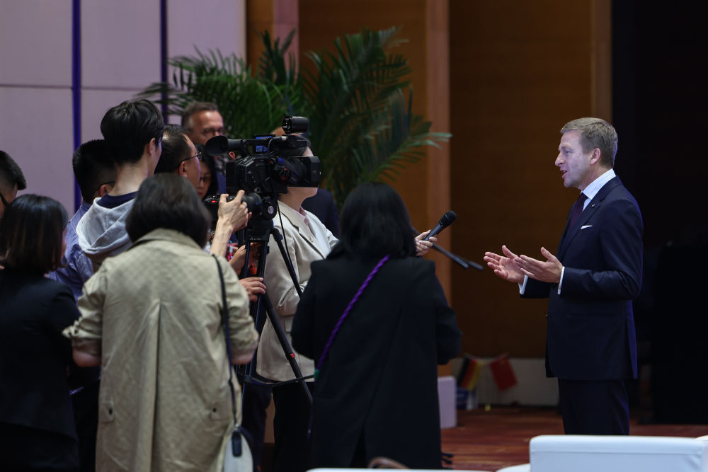 2024年4月26日,遼寧省沈陽市與寶馬集團深化戰略合作簽約儀式在沈陽舉行,這是寶馬集團董事長齊普策接受采訪。新華社記者 潘昱龍 攝