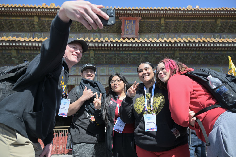 2024年3月19日,美國華盛頓州中學生代表團的成員在故宮乾清宮前合影留念。新華社記者 李鑫 攝
