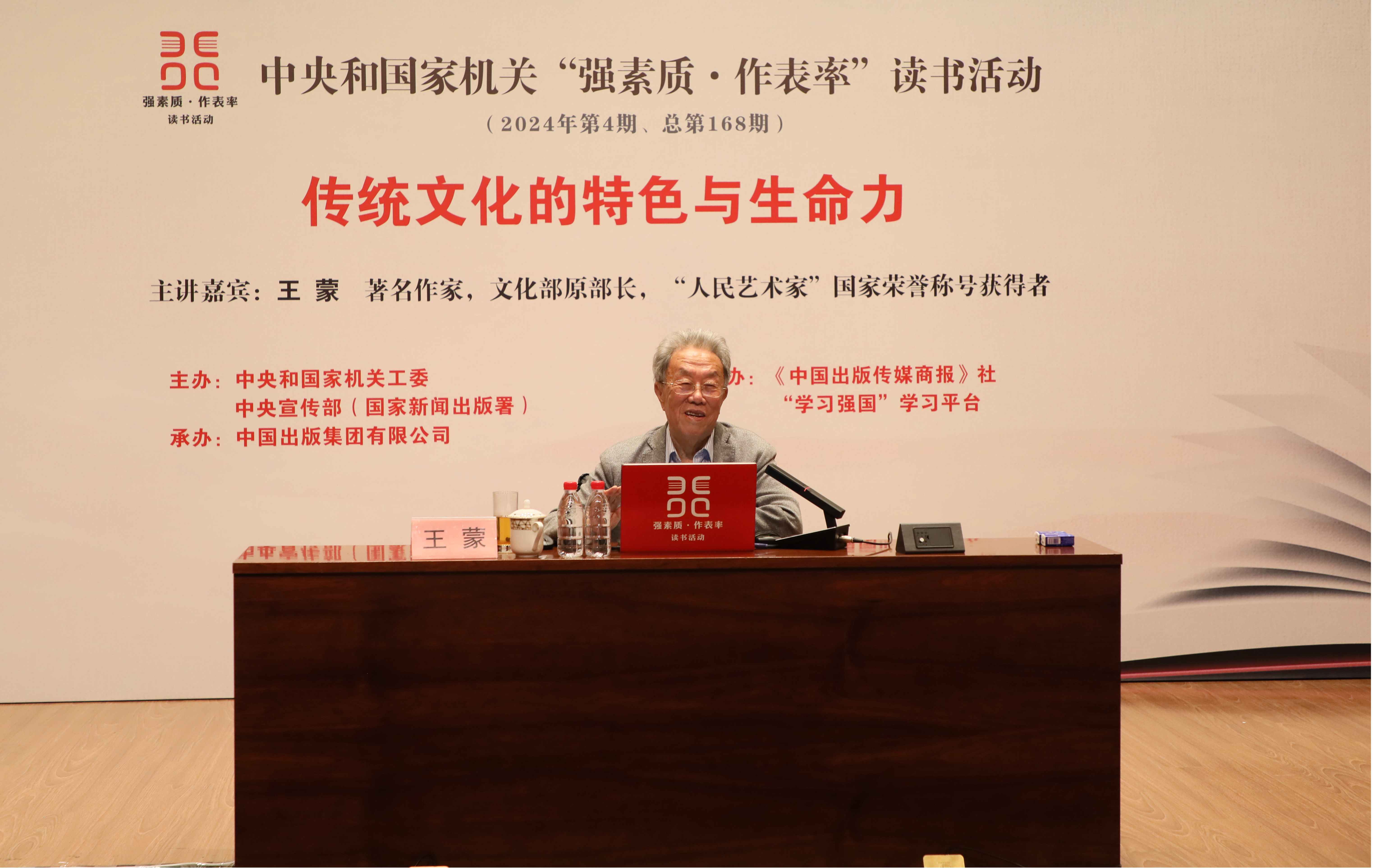 5月26日,中央和國家機關“強素質·作表率”讀書活動2024年第4期主題講座在京舉辦。著名作家、文化部原部長、“人民藝術家”國家榮譽稱號獲得者王蒙以《傳統文化的特色與生命力》為題作講座。中央和國家機關各部門黨員干部300余人參加活動。