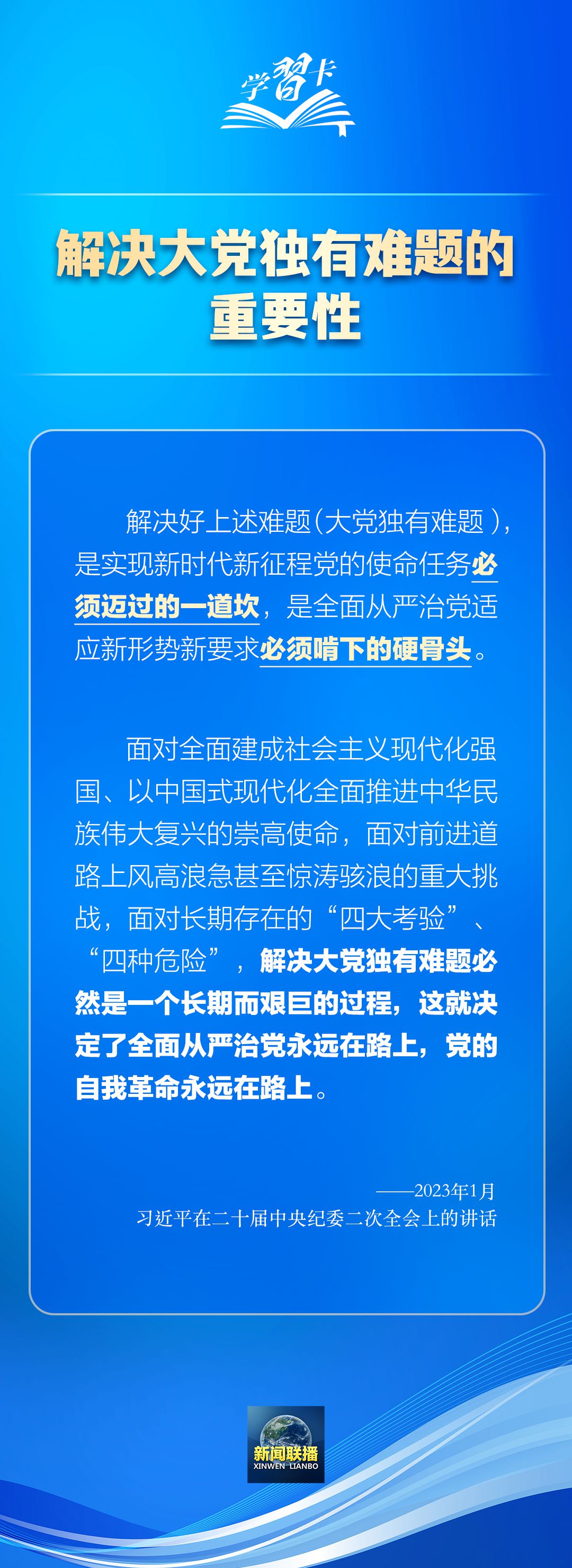 習近平總書記在不同場合多次強調全面從嚴治黨、黨的自我革命的重要性。解決好大黨獨有難題,是實現新時代新征程黨的使命任務必須邁過的一道坎,是全面從嚴治黨適應新形勢新要求必須啃下的硬骨頭。