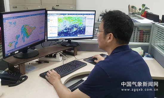 7月10日,武漢中心氣象臺預報員通過氣象預報預警服務一體化平臺分析強天氣識別產品。張文言 攝影