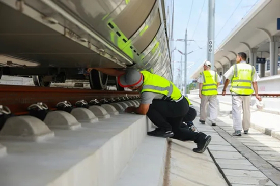 2023年6月26日,青年黨員檢查試驗動車組車下部件狀態。