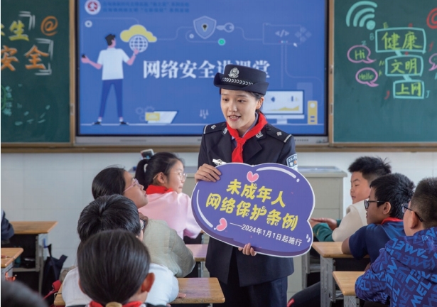 >> 2023年10月31日,江蘇省海安市白甸鎮中心小學校園內,民警向學生們介紹《未成年人網絡保護條例》。