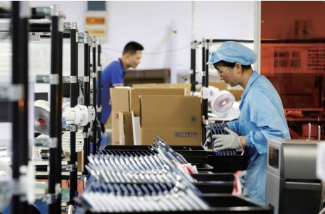 >> 2024年7月16日,工人在位于江蘇泗洪經濟開發區的車間內趕制出口電子產品。