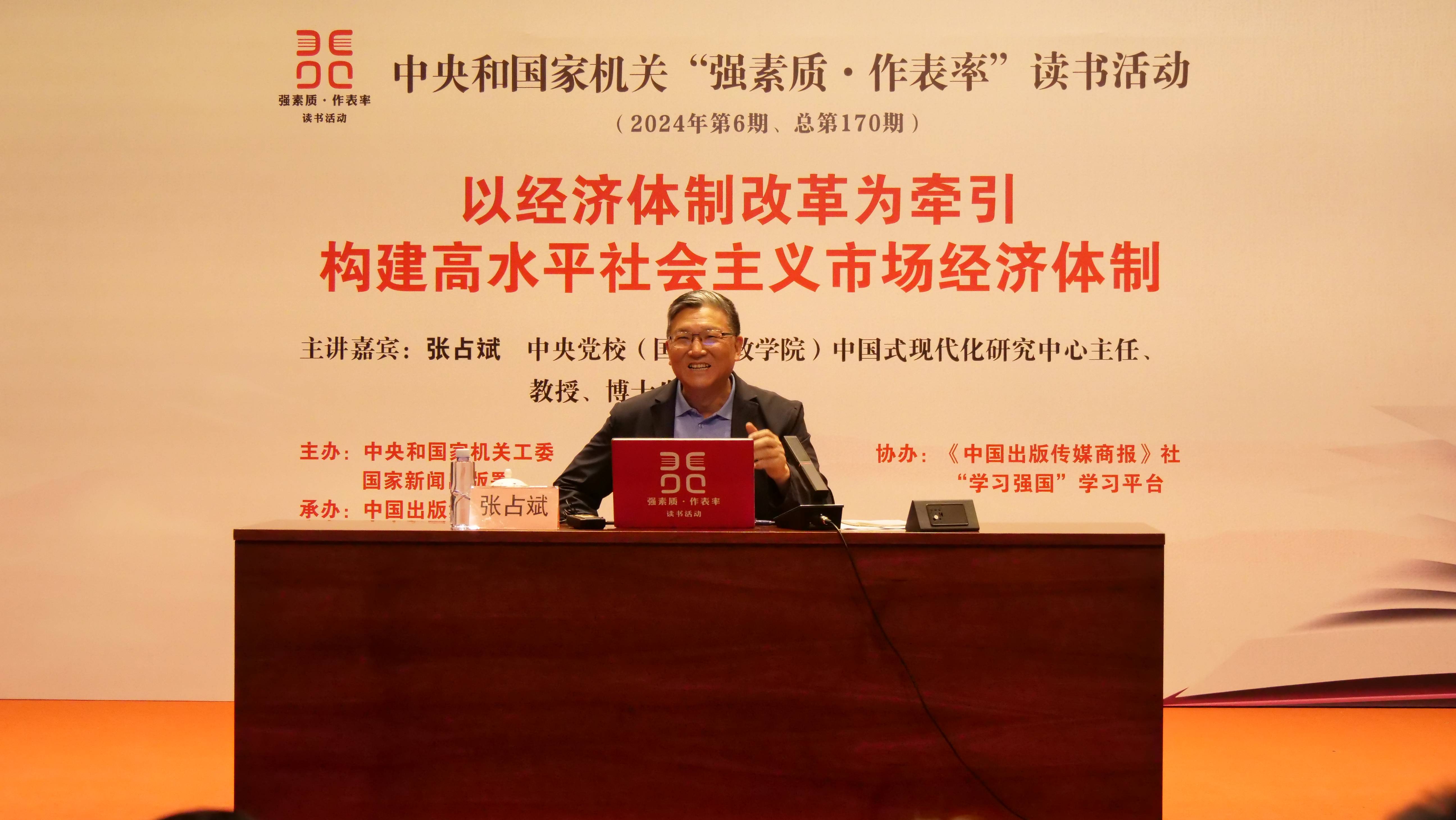 9月22日,中央和國家機關“強素質·作表率”讀書活動學習貫徹黨的二十屆三中全會精神專題講座在京舉辦。中央黨校(國家行政學院)中國式現代化研究中心主任、教授、博士生導師張占斌以《以經濟體制改革為牽引構建高水平社會主義市場經濟體制》為題作講座。中央和國家機關各部門黨員干部300余人參加活動。