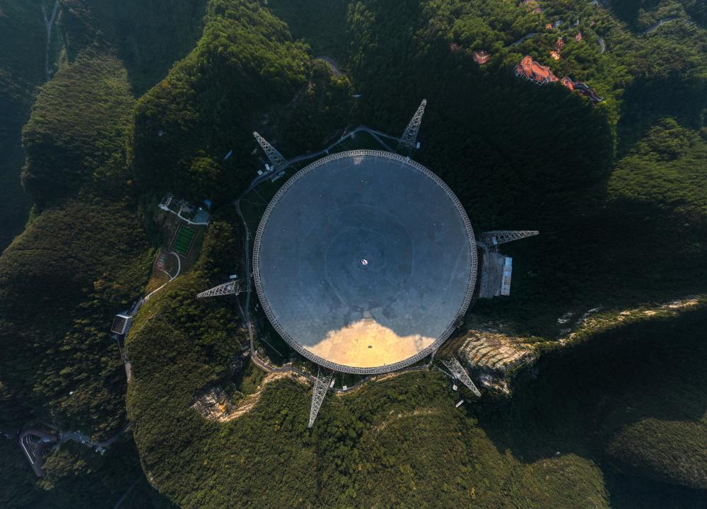 中國天眼在落日余暉中(無人機(jī)照片,維護(hù)保養(yǎng)期間拍攝,2024年9月25日攝)。新華社記者 劉續(xù) 攝
